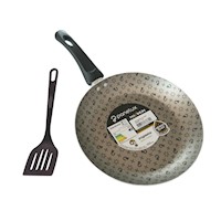 El recubrimiento antiadherente evita que los alimentos se peguen facilitando su limpieza. Fondo con aros difusores que distribuyen el calor uniformemente, proporcionando una cocción más rápida y ahorro de energía. Mango de bakelita en color negro aislante de calor con diseño ergonómico para un manejo cómodo y seguro. De uso doméstico. Además por la compra, llévate GRATIS una espátula antiadherente.